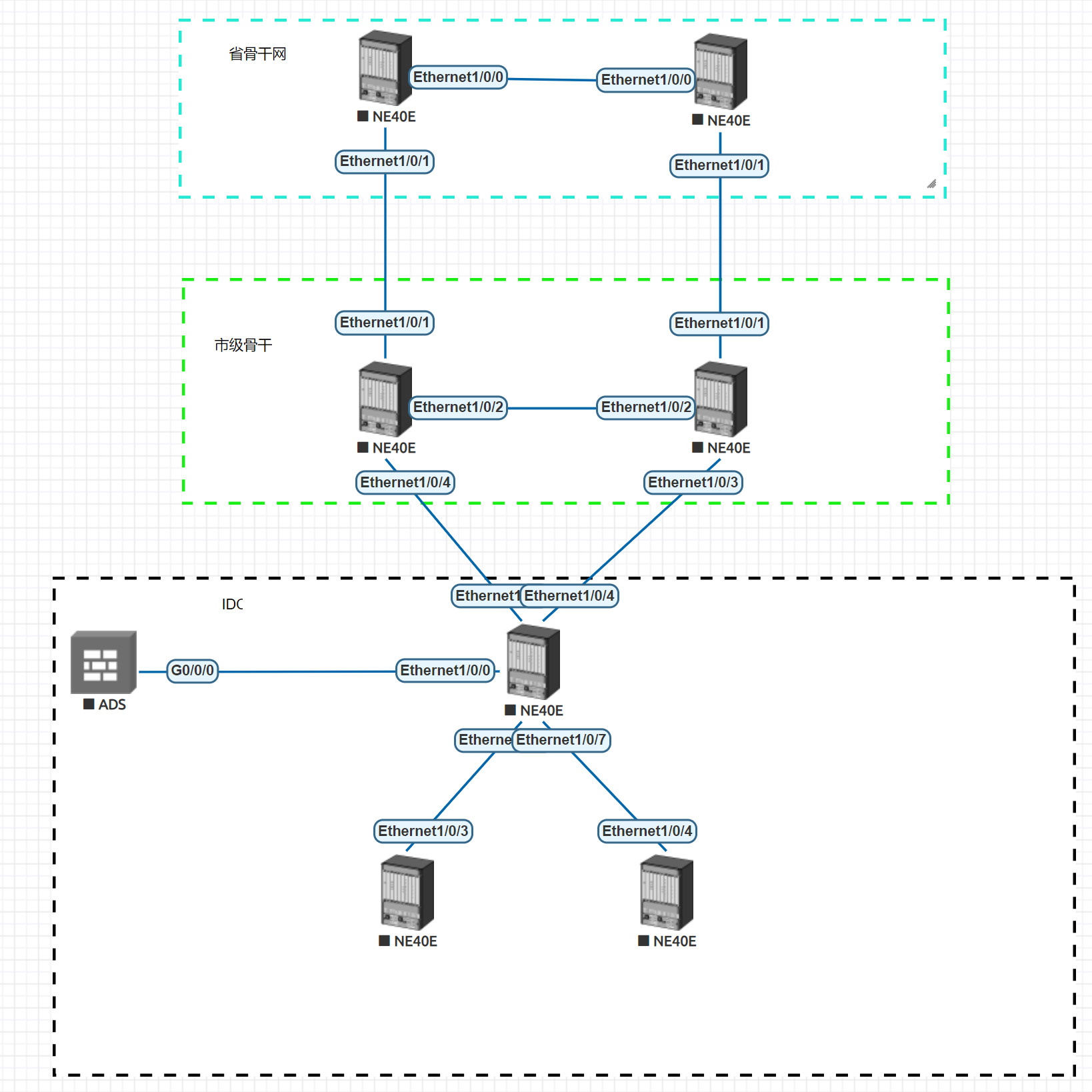 拓扑为简要逻辑拓扑,该IDC机房位于市级接入,接入总带宽20G,市级到IDC使用ECMP做负载,自有IP通过与省骨干网建立BGP Neighbor发布,该市级与省级骨干互联带宽充足,设备均为华为NE系列。