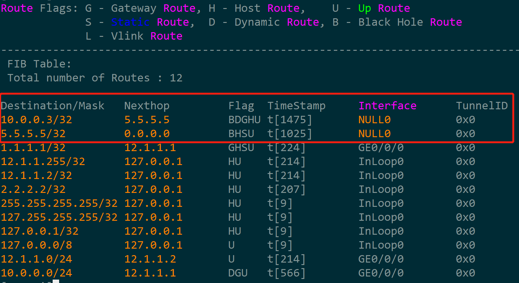 1 | ip route-static 10.0.0.3 255.255.255.255 NULL0 tag 333 |